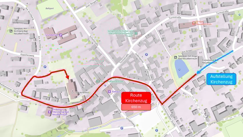 🚶♂️ Die Route führt uns durch den Ort bis zur Kirche, vorbei an Dorfteich, Marktplatz, Kindergarten und weiter zum Friedhof.